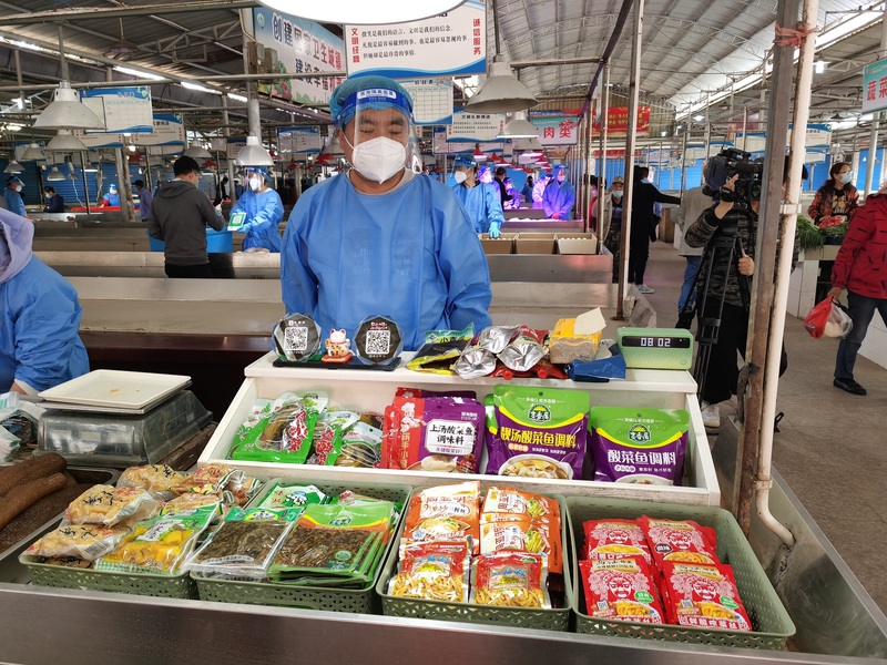 记者看到,集贸市场里,共有蔬菜摊、肉摊、面食摊、酱菜摊、水产摊等各色摊位共几十个,摊主们的“装备”统一:身穿“大蓝”服,戴着面屏、N95口罩和蓝色橡皮手套。虽未完全回归昔日的热闹,但熟悉而久违的烟火气已然在集贸市场内升腾起来。