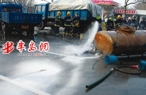 而消防队员正扛着水枪不断地用清水稀释着流向地面的浓盐酸。“这盐酸流得太多了,我们只能采用稀释法进行抢险!”兴华路消防中队的消防队员告诉记者。