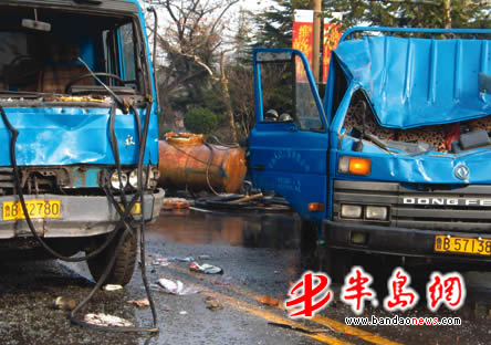 12月6日中午11时45分左右,一辆装满浓盐酸的货车由于紧急刹车侧翻在了四流中路上,随后一辆满载煤炭的货车又与它撞了个结实。三吨浓盐酸从被撞出的缺口处不断涌出。记者在现场看到,泄漏的盐酸距离附近的加油站只有十余米,而肇事车司机之前竟没经过任何运输危险品的培训。