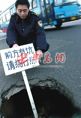 12月15日,市南城管四中队队员巡查发现,文登路东段路面一夜之间塌陷出一个大坑。从坑口望下去,坑洞有一米多深,里面的地基已大片缺失,坑口附近2平方米的路面悬空,车辆从附近通行时非常容易陷进坑内。