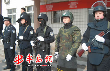 2月27日上午9时许,在市公安局治安支队五大队驻地,当五名分别着日常巡逻装备、夜间反恐装备、反恐特殊任务装备、突发性群体事件装备、突击任务装备的防暴民警(图一从左到右)一亮相,立即被参观者围了个水泄不通。