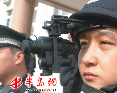 最抢眼的是执行夜间反恐任务的民警,他的头盔上配备了一个夜视仪(图二),这种装备是首次在市民面前亮相。据介绍,这种夜视仪能将肉眼无法观测到的微光放大达到观测效果,可在黑暗中观测到400米左右的距离(图三)。