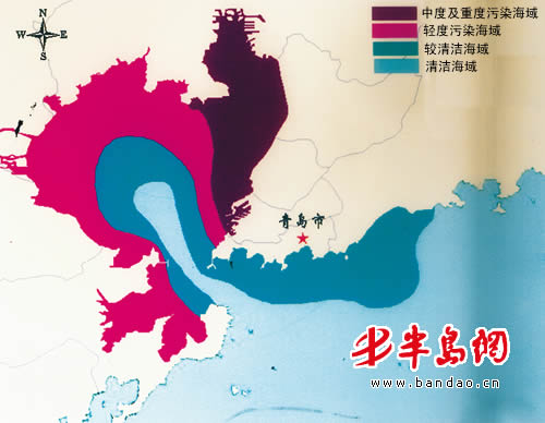本市 730公里的海岸线上分布着 49处海湾。其中,胶州湾、即墨市丁字湾、黄岛区唐岛湾和胶南市大港口近岸局部海域污染较重;胶南市大港口近岸局部海域属于严重污染海域;胶州湾由于海域面积缩小,纳潮量减少,自净能力削弱等因素影响,污染较重,东北部海域受“白泥”(即碱蒸馏残渣,是制碱过程中产生的一种白色废弃物。入海后造成海水污染)污染影响,已使该海域呈“白斑”状;团岛污水处理厂邻近海域水质超过三类水质标准。