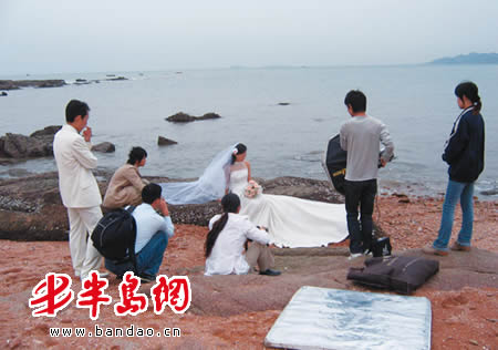 外地新人来青举行婚礼,礼服和摄像师怎么解决?记者采访了解到,这些新人的礼服和摄像师大都是请本地婚纱影楼代办,从8月份开始,就有很多外地新人向影楼预约十一期间的婚礼摄像、拍照。据了解,昨天和今天,平均每天有200余对外地新人在青岛“海誓山盟”。