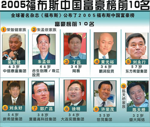 据新华社北京11月3日电 全球著名杂志《福布斯》3日在京公布了2005福布斯中国富豪榜。这是《福布斯》杂志自从1995年推出第一份富豪榜以来,第8次公布这个榜单。