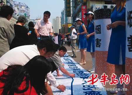 5月31日上午,市环保局在台东步行街举办了一场“摆脱烟害,万人签名活动”,记者在现场看到,许多市民纷纷在签名横幅上留下了自己的姓名,表达自己摆脱烟害的信心。据了解,仅今天一上午,主办方准备的12条横幅就被近两万名市民签满。 实习生 李兵 本报记者 李雯 摄影报道