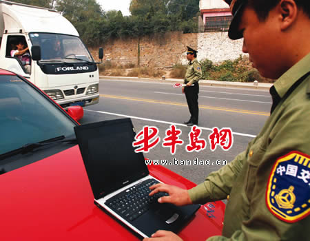 10月9日,青岛市公路局、交通稽查部门联合执法,在全市的多个重点路段,集中开展车辆养路费缴纳检查活动。稽查人员只要输入行驶的车辆车牌号码,手提电脑立刻就能显示出它的养路费征收情况。