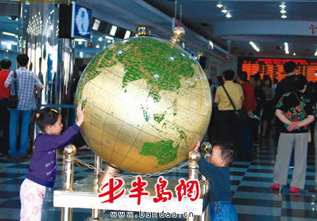 大人们忙着交易,小孩在摆弄大厅南侧的地球仪,忙着“找家”。