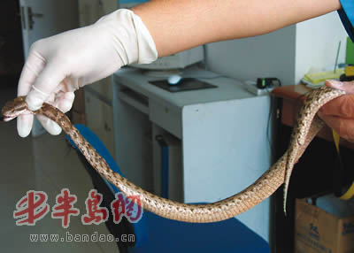 据魏老汉介绍,当天上午9时许,他到单位承包的芙蓉山上拔草时,突然左手拇指一阵钻心地疼痛,他赶快抽手,这时他低头看见,草丛下面竟盘踞着一条近一米长的蛇!
