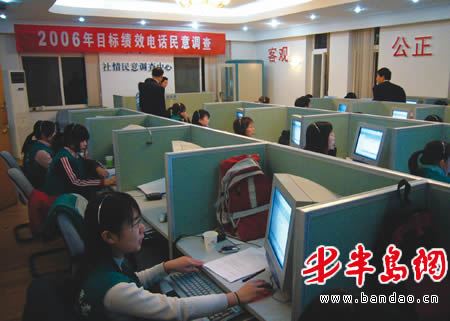 “您好,我是市统计局社情民意调查中心的访问员,为了解居民对黄岛区政府2006年有关工作的评价,我们随机抽取拨通了您的电话,占用您几分钟时间问几个问题可以吗?”记者看到,通过电脑显示屏,电话接通后,访问员开始将事先准备好的问题一一对受访者提出。
