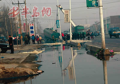 今天上午11时许,平度明村镇村民李先生向本报反映了此事。记者闻讯赶到事发现场看到,一辆油罐车横躺在路口西侧,油罐车尾部被撞坏,油罐内的原油大部分已经泄漏。附近马路上形成了一条长300多米、宽5米的“油河”。