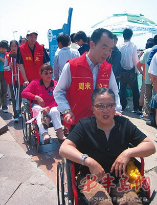 义工柴红卫一早就从李沧赶到五四广场,在现场帮忙散发残疾人康复及就业的相关宣传材料,随后推着轮椅陪侯春玲阿姨沿着海边走了一圈,把侯阿姨乐得合不拢嘴。义工王丽本来今天有事,但一听是为残疾人献爱心,忙里偷闲帮着发了一个小时的宣传材料,才又匆匆离开。