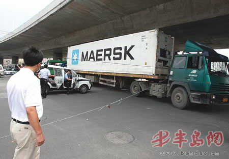 烟台牌照的集装箱车司机告诉记者,他开空车准备返回黄岛,从新快速路下的鞍山路自东向西行驶时,只在距事发现场200多米处看到一处限高5米的提醒标志,而自己的车高只有4.2米,根本没想到能发生这种意外。在事发现场附近,记者没看到限高标志。