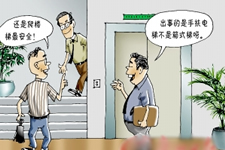 - b.电梯冲顶或者下坠。应对方法:第一,不论有几层楼,赶快把每一层楼的按键都按下。当紧急电源启动时,电梯可马上停止继续下坠。第二,如果电梯里有手把,一只手紧握手把,这样可固定人所在的位置,使你不至于因重心不稳而摔伤。第三,整个背部跟头部紧贴电梯内墙,呈一直线。要运用电梯墙壁作为脊椎的防护。第四,膝盖呈弯曲姿势。因为韧带是人体唯一富含弹性的一个组织,借用膝盖弯曲来承受重击压力,比骨头承受压力会更大。