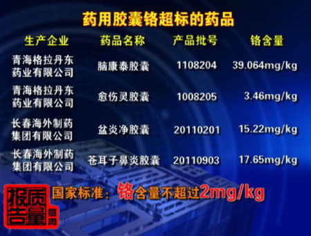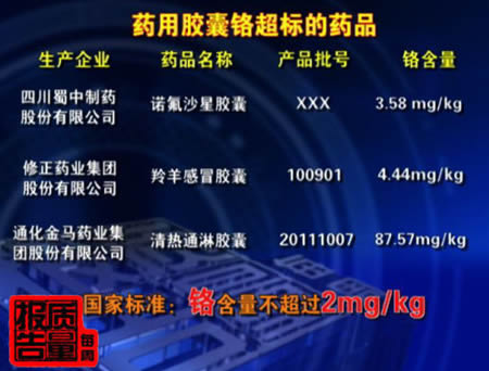 央视每周质量报告曝光,不法厂商使用铬超标的工业明胶生产药用胶囊,修正药业、通化金马药业、蜀中制药等9家药厂13批次的胶囊剂药品上黑榜。广州市食品药品监督管理局通报,报道中涉及的13个问题批次药品有8个曾在广州市有销售。记者获悉,北京、上海、浙江、吉林、青海等省市已展开部署调查“问题胶囊”,要求暂停销售和使用