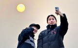 雾中夕阳更“温柔”,游客海滨享受别样傍晚
