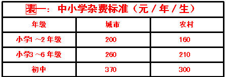 杂费(最高收费标准见表一)标准中已经考虑了取暖、信息技术教育和电教等因素。凡不能为学生提供取暖、没有开设信息技术教育课程和不具备电教条件的学校,应相应扣减对学生的收费。取暖费按农村每生每年30元、城市每生每年 60元扣除;信息技术教育费按每生每年小学(三至六年级)50元、初中60元扣除;电教费按每生每年小学16元、初中24元扣除。决不允许为多收取杂费而不顾条件、弄虚作假上取暖设施、微机等。