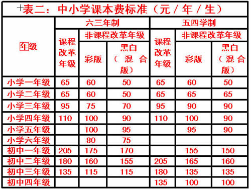 课本费(最高收费标准见表二)包括国家规定的课程用书和地方课程用书。各地选用课本必须从省教育厅公布的中小学用书目录中必须配备的学生用书(不得含教辅材料)中选定,并按照省物价、新闻出版部门核准的价格计算。鉴于有的地方今年秋季的课本已经预订,课本费可按预订种类的实际价格计算公布(教辅资料不得计入),明年春季开学要全部按“一费制”标准执行。经济欠发达地区特别是省定30个欠发达县原则上要购买黑白版课本,实行“免费提供教科书”的农村小学和初中学生的课本费应从“一费制”收费中相应扣除。这次试行“一费制”的一个重要内容是不再把教辅材料纳入课本费,各地和学校不准向学生强行推荐、购买、使用各种教辅材料。