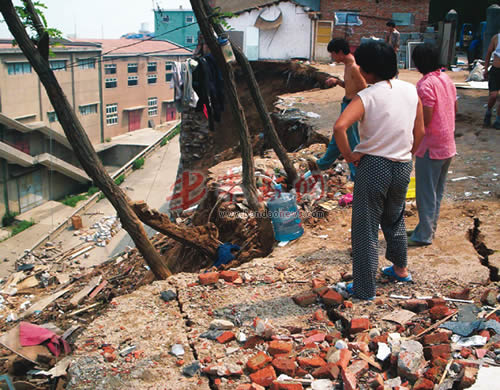 租住在该房屋内的王先生告诉记者,这里一共住了19个人,都是临沭老乡,多以捡破烂为生。昨天晚上8时许,突然有人发现地面出现了一条裂缝,大家以为发生地震了,惊叫起来慌忙逃离。“就像变戏法,地面的裂缝迅速变宽,黑黑的深不可测,从出现到变成一米多宽,也就是几十秒钟,房子整个就陷了下去”,另一名当事人说。由于他们都在院子里得以迅速逃离,才没有危及性命。