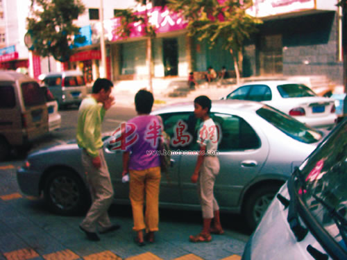 8月7日13时许,记者在云霄路上的海岛渔村酒店门口看到,有五六个领着小孩的中年妇女站在该酒店的门口。这时,一辆出租车驶来,客人刚下车,他们一哄而上,将乘客团团围住。几个小孩不停地喊着“叔叔,给点钱买些吃的吧”,还拉扯客人的衣服和背包。跟出30多米远后,客人只好掏出一元钱给他们。