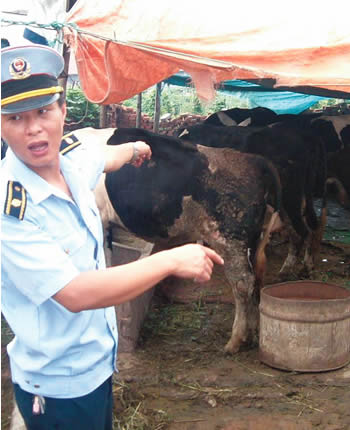 不足 30平方米的小院子里牛粪遍地,湿热的空气里弥漫着刺鼻的臭味,苍蝇围着城管队员嗡嗡乱叫。在院子南头近15平方米的一块地方搭着个棚子,6头奶牛正在破旧的棚子下吃草。牛身下的大片地方都被牛粪占满了,几位挤奶工并未戴手套,徒手为其中 3头奶牛挤奶,而盛“鲜奶”的塑料桶壁上还沾着牛粪,桶内掺杂不明的黄色液体。据该院一工作人员说,这里每天大约产奶 100余公斤,是放心奶,销路非常好,附近几个村的居民都到此处订货。