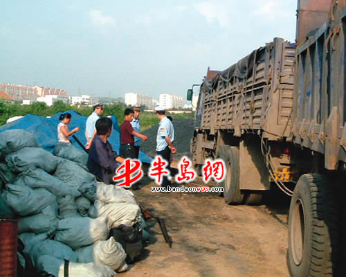 晚上 11时许,记者与李沧城管一中队队员根据群众举报,事先埋伏在金水路附近某村民家中。今天凌晨2时许,一辆挂河北牌照的运煤拖挂车悄悄驶来,该车在金水路兜了 3个大圈后,驶进一片树木掩映的院落。在昏暗的灯光下,院子内的工人将煤卸进院落内塑料棚布遮掩下的一个直径大约30米的大坑中。凌晨3时40分,城管队员将该煤场包围,扣押了在现场准备卸运的4辆煤车,查获各类劣质散煤60多吨。