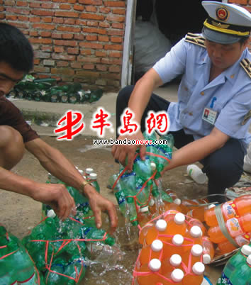 8月21日,市质监稽查局执法人员根据群众举报,在城阳区惜福镇书院村捣毁一家用色素、香精加井水调制各种汽水的生产窝点,该厂不具备生产条件,既无检测设备,也无检测人员。