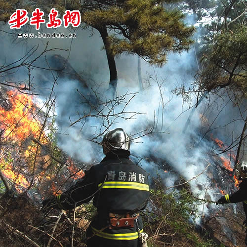 当记者赶到社会福利院东北侧时,远远看到山头被遮天蔽日的浓烟笼罩,通红的火苗在山坡上肆虐蔓延。崂山区的消防车、警车迅速往各起火点赶。据悉,消防战士、公安民警、中韩街道办和沙子口街道办的专业森林防火队员等共50余人赶到了现场。