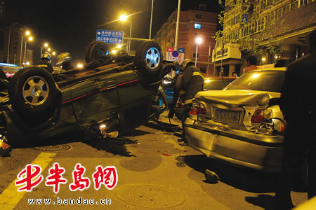 当晚,记者接市民雷先生给本报打来的热线后,迅速赶到车祸现场,看到一辆吉普车“四脚朝天”,玻璃碎了一地,在其车尾部一辆福特和一辆桑塔纳轿车尾部被撞坏,在该车东面 20多米的地方,一辆依维柯斜停在路中间,同时有很多隔离墩“斜躺”在路中间。