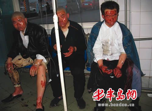 记者在市立医院见到了受伤的黄先生三人。他们身上刚刚被摸上烫伤膏,并且打上了吊瓶,身边放着已经被烧焦的衣服。黄先生的牛仔裤已经被烧成了“裤衩”,连他贴身的秋裤都被烧成了一片一片的。三人的脸部全都被烧起了皮,并且肿了起来。黄先生的伤势最为严重,两只手被严重烧伤,不住地颤抖。