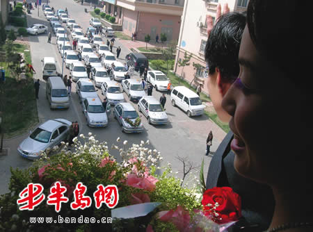 8时58分,32辆夏利从浮山后新郎家赶到错埠岭新娘家楼下,吸引了众多居民围观。住错埠岭小区的张小姐和男朋友被这场面感动,跟着车队走了近 1000米。两人还约定,结婚的时候一定也要搞一个像这样既经济又排场的婚车队。