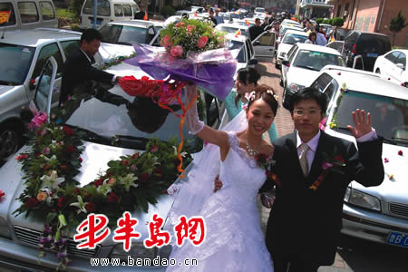 在婚车里,记者采访了新娘小腾,她说,在别人看来,结婚时迎亲车队的头车一定要是名车,可她和大昭都是夏利车的“发烧友”,“我们放弃了原本‘奢侈’的想法,并将组建同品牌的车辆为迎亲车队的想法发到了半岛网,没想到,这一想法立即得到了朋友们的支持。”