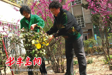 两个老邻居共同打理花坛