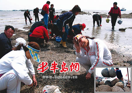 大图:游客正在挖蛤蜊 小图:大量蛤蜊被吊上岸