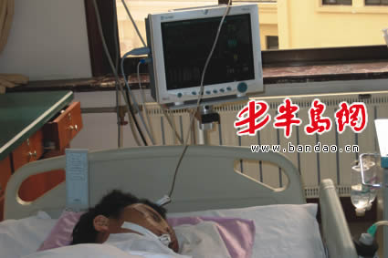 鼻梁粉碎,嘴裂成好几半,眼珠破裂脱离造成双目失明,眼睛、嘴巴、耳朵不断地往外渗漏脑积液……今天下午,记者在青医附院脑外科ICU见到了面目全非的万某,一直陪护他的堂哥万先生告诉记者,堂弟和他妻子乔某几年前来青打工,在胶州租了房子,堂弟一直给人家做木匠活,弟媳则一直没有工作,平时生活还算平稳。