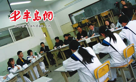 在青岛二中教学楼的三楼,记者看到了戒备森严的四个考场。每个考场里的桌子都摆成三角形,三角形的一边坐着7名评委,另两边则留给参加面试的考生,考场上设置了一台摄像机,记录下面试的全过程。