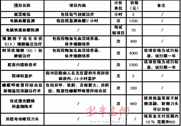 此次颁布的10项新医疗服务项目价格,是本市相关部门对各医疗机构申报的部分医疗项目进行审核和成本核算后,结合本市实际情况确定的。这 10项医疗服务项目分别是面罩吸氧、电脑血糖监测、电脑快速血糖检测、细胞因子活化杀伤(CIK)细胞输注治疗、树突状细胞(DC)抗肿瘤治疗、胶囊内镜检查术、精神科监护、睡眠呼吸暂停综合征射频温控消融治疗术、经皮激光腰椎间盘摘除术和鼻腔电动吸切刀头等;同时废止的现行项目有 4个,分别是面罩吸氧、电脑血糖监测、细胞因子活化杀伤(CIK)细胞输注治疗和精神科监护。
