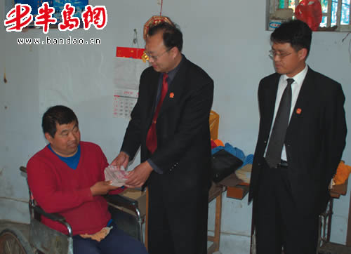 5月13日上午,当平度市蓼兰镇高位截瘫的杨广喜坐在轮椅上,颤抖着双手从平度市人民法院蓼兰法庭的法官手中接过24万元的赔偿款时,激动得说不出话来(图)。