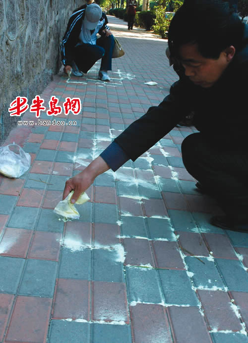 当日下午,记者再次赶到现场,发现几名环保局工作人员正在用淡黄色的工业硫磺粉对水银进行处理,人行道上出现了一条长长的“白线”。