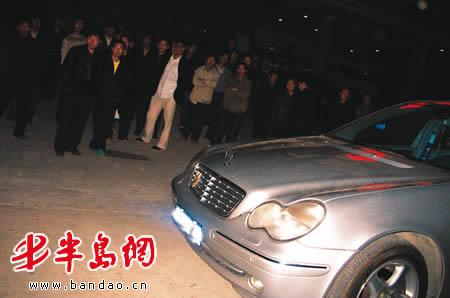 5月16日晚10时30分许,记者赶到了万杰医院。在医院急诊大厅门前的停车场上,几十名建筑工人将一辆白色的奔驰轿车团团围住。