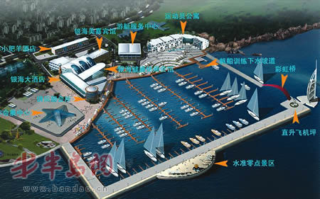 青岛银海国际游艇俱乐部旅游区2003年3月开工建设,项目总投资3亿元人民币,陆域面积48600平方米,海域面积86600平方米,整个旅游区内有专业码头、游艇泊位、干船坞、修船坞、帆船训练基地、运动员公寓等配套设施。