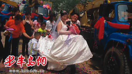 开着长长的吊车娶亲,是不是作秀?新郎吕先生解释说,他本身就是一名吊车司机,吊车就是自己的劳动工具,用劳动工具迎娶新娘,他觉得很有意义,因为一切都是从劳动中得到的!新娘梅女士说,她一点儿也不觉得委屈!虽然吊车不像轿车那样风光,但吊车能见证他们俩的爱情,闲来翻开这些照片,看到自己的婚车就是丈夫的吊车,才能更加珍惜幸福的生活。