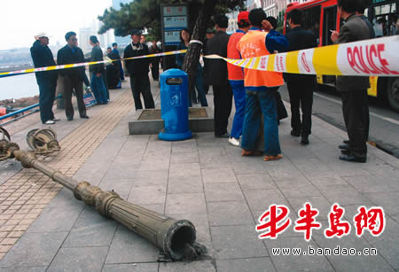 记者赶到现场时看到,路上横着一根的路灯杆,其底部已经断裂,灯杆上面的灯泡已经摔碎,被砸中的4名学生被送往医院救治。现场的一名学生告诉记者,他们是德州学院的学生,这次专门来青岛采集海洋标本,同学们采集完标本后从太平路由西向东行走,刚走到栈桥公交车站时,路灯杆就断裂了,砸向了他们,4名同学的头部顿时流血了。
