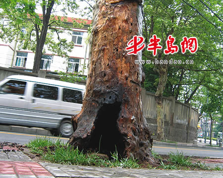 记者随后从市消防部门了解到,街头中空的行道树频酿险情:2月份,江苏路一棵法桐树突然起火;4月26日 18时许,平原路与黄岛路交会处的一棵法桐树起火……记者在江苏路看到,不到100米的距离内竟然有12棵法桐树存在干枯现象。