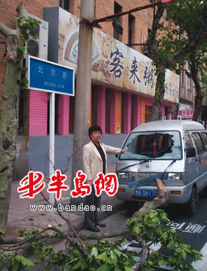 半岛网5月25日讯(记者 周辉) 今天上午10时许,一阵大风将北京路人行道上一棵大树的病树枝刮断,断树枝随后将停放在树下的一辆面包车前挡风玻璃砸碎(上图)。事发后,车主联系有关部门要求赔偿时遭到拒绝。