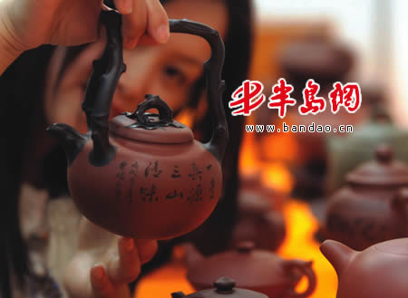 半岛网5月26日讯(记者 刘延珉 刘兆球 见习记者 赵成林 通讯员孟繁) 今天上午,在喧天的锣鼓和军乐声中,国际茶界最高级别的节庆活动———第九届国际茶文化研讨会暨第三届崂山茶文化节在市文化博览中心广场拉开帷幕。在国际会展中心举行的名优茶博览会上,百余种中外名茶让现场的市民过足了“茶瘾”,身价 7.8万元的紫砂茶壶、百余年的云南普洱茶让参观者大开眼界。