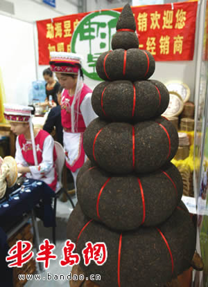 在云南普洱茶展厅负责人边泡茶边向参观者讲解,云南普洱茶是国内唯一一种经发酵而成的“熟茶”,该茶以“越陈越醇”著称。十年以上的普洱茶每斤售价在万元以上而他们珍藏的一块生产于上世纪初的云南普洱茶已经是无价之宝了。