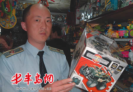 今天上午,记者随市北工商分局利津路工商所执法人员对台东商业圈内万寿路、顺兴路附近的玩具经营店进行突击检查。在顺兴路附近的一家玩具经营店,执法人员发现,该店里小轿车、吉普车、机枪等塑料玩具应有尽有,但不少玩具外包装上没有中文标志,更没有使用说明和注意事项。一个发光枪包装盒上贴的竟是电动车的合格证。
