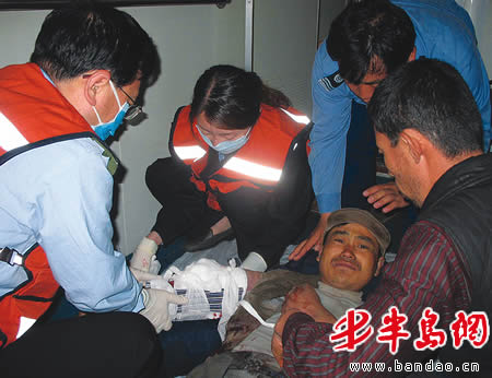 记者看到,受伤的渔民右胳膊肘已经断裂,而且还在往下滴血。医护人员急忙用药物敷在伤口上,拿出夹板将伤者的断胳膊进行固定,并及时为其输氧。两个多小时后,伤者的嘴唇开始泛出红色,伤情也开始稳定下来。