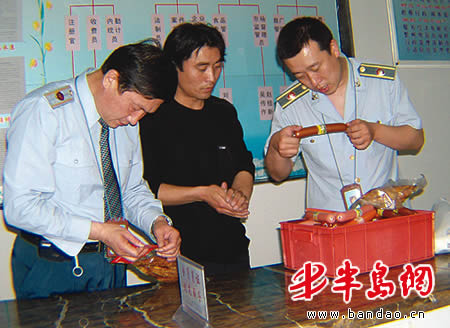 5月31日下午,市工商局消保处与四方工商分局、宣化路、重庆南路工商所的执法人员共 20余人分头行动,将该食品公司位于小水清沟、湖岛的两个销售点同时取缔,当场查扣过期火腿肠和包装酱货以及涉嫌过期肉食品共 200余公斤。